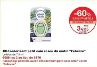 Actuellement en offre chez Monop' : FEBREZE Désodorisant petit coin rosée du matin ✅ Valable du 20-01 au 1-02.
