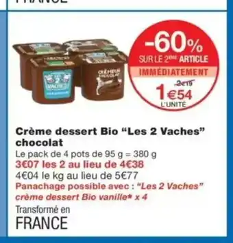 Actuellement en offre chez Monop' : LES 2 VACHES Crème dessert Bio chocolat ✅ Valable du 16-02 au 1-03.