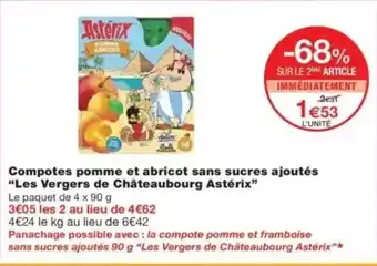 Actuellement en offre chez Monop' : LES VERGERS DE CHÂTEAUBOURG ASTÉRIX Compotes pomme et abricot sans sucres ajoutés ✅ Valable du 16-02 au 1-03.