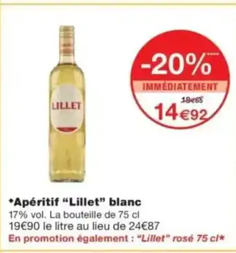 Actuellement, LILLET Apéritif blanc est en promotion chez Monop'. Toutes les informations utiles comme le prix, les conditions et la durée de validité sont affichées sur cette page. Consultez également les promotions similaires pour LILLET Apéritif blanc, afin de faire le meilleur choix. La promo LILLET Apéritif blanc est valable du 16-02-2026 au 01-03-2026. Si elle est expirée, regardez les autres offres équivalentes. Vous pouvez aussi suivre cette catégorie de produit pour être alerté lorsqu’une nouvelle promotion LILLET Apéritif blanc apparaît chez Monop'.Questions fréquemment posées au sujet de LILLET Apéritif blanc