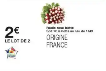 L'offre est disponible dans plusieurs magasins, vérifiez tous les produits pour obtenir le Radis rose botte le moins cher. Si vous souhaitez savoir si l'article est en vente avec une plus grosse remise dans un autre magasin, consultez la catégorie 'Supermarché'. Ces offres pourraient aussi vous intéresser : offre 1, offre 2 & offre 3.
