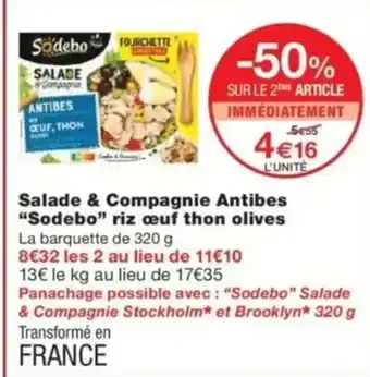 Actuellement en offre chez Monop' : SODEBO Salade & Compagnie Antibes riz oeuf thon olives ✅ Valable du 16-02 au 1-03.