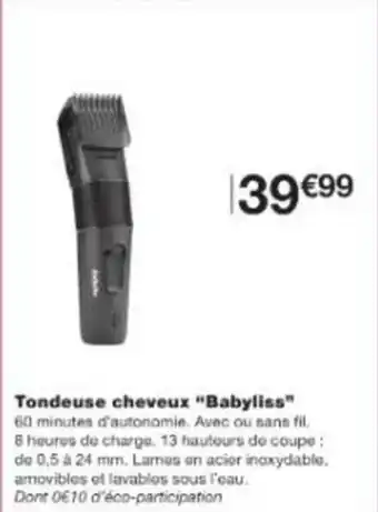 Actuellement, Tondeuse cheveux babyliss est en promotion chez Monop'. Toutes les informations utiles comme le prix, les conditions et la durée de validité sont affichées sur cette page. Consultez également les promotions similaires pour Tondeuse cheveux babyliss, afin de faire le meilleur choix. La promo Tondeuse cheveux babyliss est valable du 20-04-2026 au 03-05-2026. Si elle est expirée, regardez les autres offres équivalentes. Vous pouvez aussi suivre cette catégorie de produit pour être alerté lorsqu’une nouvelle promotion Tondeuse cheveux babyliss apparaît chez Monop'.Questions fréquemment posées au sujet de Tondeuse cheveux babyliss