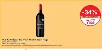 Actuellement en offre chez Monoprix : A.O.P. Bordeaux Supérieur Mouton Cadet rouge ✅ Valable du 1-01 au 18-01.