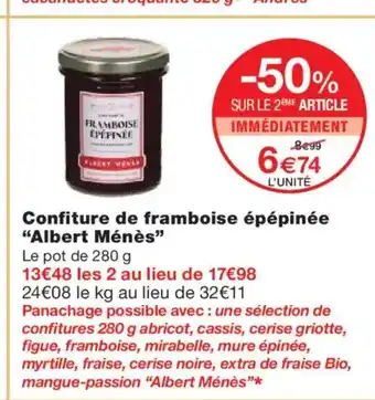 Actuellement en offre chez Monoprix : ALBERT MÉNÈS Confiture de framboise épépiné ✅ Valable du 20-01 au 1-02.