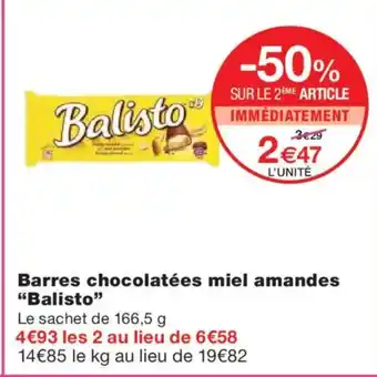 Offre BALISTO Barres chocolatées miel amandes chez Monoprix
