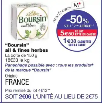 En plus de l'offre BOURSIN ail & fines herbes, Monoprix propose une large gamme de produits. Consultez le Catalogue Monoprix hebdomadaire pour découvrir les meilleures offres et promotions. En plus de BOURSIN ail & fines herbes, il y a aussi : TARTARE ail & fines herbes, TIPIAK Croûtons salade ail & fines herbes & PAYSAN BRETON Le fromage fouetté ail et fines herbes madame loïk.