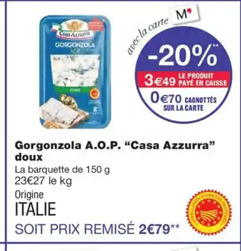 Actuellement en offre chez Monoprix : CASA AZZURRA Gorgonzola A.O.P. doux ✅ Valable du 16-12 au 31-12.