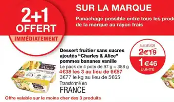 Actuellement en offre chez Monoprix : CHARLES & ALICE Dessert fruitier sans sucres ajoutés pommes bananes vanille ✅ Valable du 21-04 au 3-05.