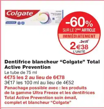 Actuellement en offre chez Monoprix : COLGATE Dentifrice blancheur Total Active Prevention ✅ Valable du 3-02 au 15-02.