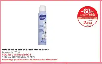 Actuellement en offre chez Monoprix : Déodorant lait et coton monsavon ✅ Valable du 3-03 au 22-03.