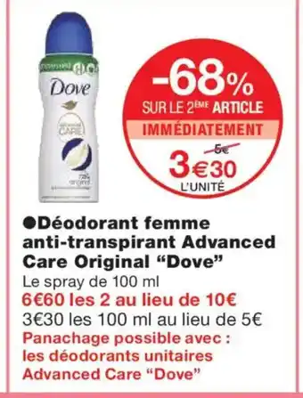 Offre DOVE Déodorant femme anti-transpirant Advanced Care Original chez Monoprix