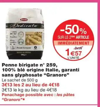 Actuellement en offre chez Monoprix : GRANORO Penne birigate n° 259, 100% blé origine Italie, garanti sans glyphosate ✅ Valable du 16-12 au 31-12.