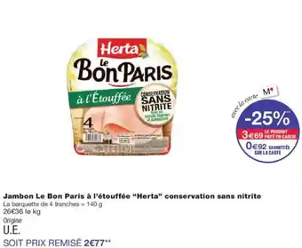 En plus de l'offre Jambon le bon paris à l'étouffée herta conservation sans nitrite, Monoprix propose une large gamme de produits. Consultez le Catalogue Monoprix hebdomadaire pour découvrir les meilleures offres et promotions. En plus de Jambon le bon paris à l'étouffée herta conservation sans nitrite, il y a aussi : Herta - le bon paris jambon à l'étouffée conservation sans nitrite, Herta jambon à l'étouffée conservation sans nitrite le bon paris & HERTA Le bon paris jambon à l'étouffée conservation sans nitrite.