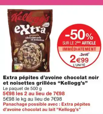 Actuellement en offre chez Monoprix : KELLOGG'S Extra pépites d'avoine chocolat noir et noisettes grillées ✅ Valable du 16-12 au 31-12.