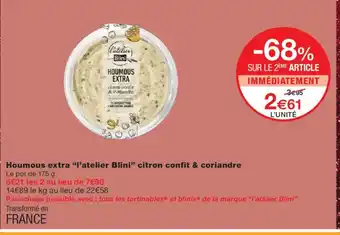 Actuellement en offre chez Monoprix : L'ATELIER BLINI Houmous extra citron confit & coriandre ✅ Valable du 16-12 au 31-12.