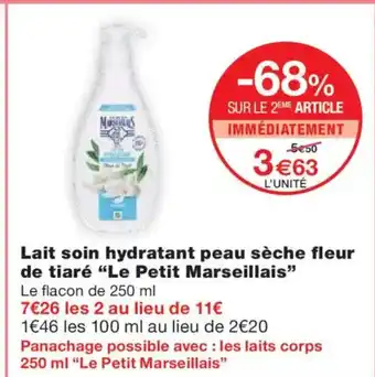 Offre LE PETIT MARSEILLAIS Lait soin hydratant peau sèche fleur de tiaré chez Monoprix