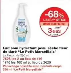 Actuellement en offre chez Monoprix : Le petit marseillais - lait soin hydratant peau sèche fleur de tiaré le petit marseillais ✅ Valable du 20-01 au 1-02.