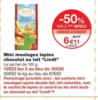 Actuellement en offre chez Monoprix : LINDT Mini moulages lapins chocolat au lait ✅ Valable du 24-03 au 6-04.