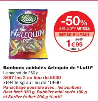 Actuellement en offre chez Monoprix : LUTTI Bonbons acidulés Arlequin de ✅ Valable du 17-02 au 1-03.