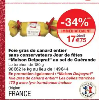 Y a-t-il une promotion sur MAISON DELPEYRAT Foie gras de canard entier sans conservateurs Jour de fêtes au sel de Guerande la semaine prochaine chez Monoprix ?
