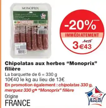 MONOPRIX Chipolatas aux herbes filière offres et promotions en ligne chez Monoprix