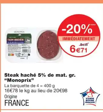 Actuellement en offre chez Monoprix : MONOPRIX Steak haché 5% de mat. gr. ✅ Valable du 17-02 au 1-03.
