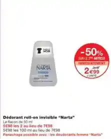 Actuellement en offre chez Monoprix : Narta - déodorant roll-on invisible narta ✅ Valable du 1-01 au 18-01.
