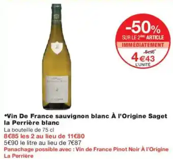 Vin de france sauvignon blanc à l'origine saget la perrière blanc : offres et promos Monoprix à découvrir