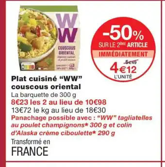 En plus de l'offre WW Plat cuisiné couscous oriental, Monoprix propose une large gamme de produits. Consultez le Catalogue Monoprix hebdomadaire pour découvrir les meilleures offres et promotions. En plus de WW Plat cuisiné couscous oriental, il y a aussi : Plat cuisiné marie, Plat cuisiné d'aucy & Plat Cuisiné Marie.