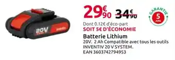 L'offre est disponible dans plusieurs magasins, vérifiez tous les produits pour obtenir le Batterie Lithium le moins cher. Si vous souhaitez savoir si l'article est en vente avec une plus grosse remise dans un autre magasin, consultez la catégorie 'Bricolage'. Ces offres pourraient aussi vous intéresser : Batterie lithium mx24 v 4ah, Batterie lithium mx24 v 4ah & Lawnmaster batterie lithium mx24 v 4ah.