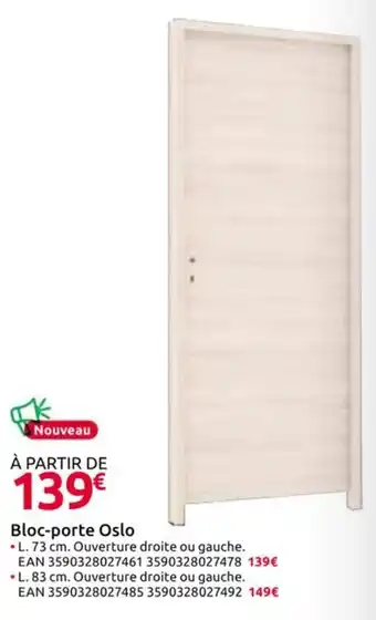 En plus de l'offre Bloc-porte Oslo, Mr Bricolage propose une large gamme de produits. Consultez le Catalogue Mr Bricolage hebdomadaire pour découvrir les meilleures offres et promotions. En plus de Bloc-porte Oslo, il y a aussi : Bloc porte, Kit porte coulissante Oslo & Dim - bloc porte chene.