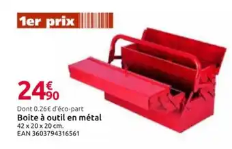 Le prix de l'offre Boite à outil en métal se trouve également en haut de la page, ainsi que la date à laquelle l'offre est disponible. Vous pouvez également vérifier les prix dans le Catalogue Mr Bricolage actuel ou sur le site Internet de Mr Bricolage. Les offres vous permettent d'acheter les produits Mr Bricolage au prix le plus bas.