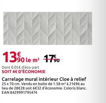 Actuellement en offre chez Mr Bricolage : Carrelage mural intérieur Cloe à relief ✅ Valable du 25-03 au 19-04.