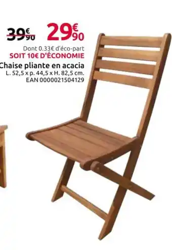 Le prix de l'offre Chaise pliante en acacia se trouve également en haut de la page, ainsi que la date à laquelle l'offre est disponible. Vous pouvez également vérifier les prix dans le Catalogue Mr Bricolage actuel ou sur le site Internet de Mr Bricolage. Les offres vous permettent d'acheter les produits Mr Bricolage au prix le plus bas.