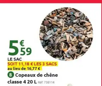 En plus de l'offre Copeaux de chêne classe, Mr Bricolage propose une large gamme de produits. Consultez le Catalogue Mr Bricolage hebdomadaire pour découvrir les meilleures offres et promotions. En plus de Copeaux de chêne classe, il y a aussi : COPEAUX DE BOIS, Copeaux de bois 70 l & COPEAUX DE BOIS NATUREN.