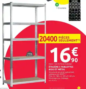 Le prix de l'offre Étagère 5 tablettes bois et métal se trouve également en haut de la page, ainsi que la date à laquelle l'offre est disponible. Vous pouvez également vérifier les prix dans le Catalogue Mr Bricolage actuel ou sur le site Internet de Mr Bricolage. Les offres vous permettent d'acheter les produits Mr Bricolage au prix le plus bas.