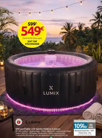 Actuellement en offre chez Mr Bricolage : LUMIX SPA gonflable LED Sainte-Hélène 6 places ✅ Valable du 25-03 au 19-04.