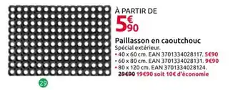 Découvrez les produits les moins chers parmi toutes les offres ! Si vous voulez savoir si Mr Bricolage propose la meilleure remise pour Paillasson en caoutchouc, comparez-la sur la page thèmes ou avec d'autres magasins.