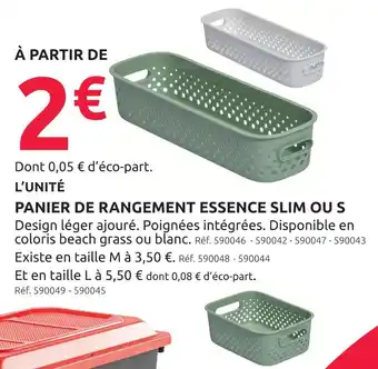 En plus de l'offre Panier de rangement essence slim ou s, Mr Bricolage propose une large gamme de produits. Consultez le Catalogue Mr Bricolage hebdomadaire pour découvrir les meilleures offres et promotions. En plus de Panier de rangement essence slim ou s, il y a aussi : Panier de rangement, Dim - panier de rangement & Le panier à linge slim rattan.