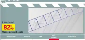 Plaque polycarbonate bénéficie actuellement d'une réduction chez Mr Bricolage. Vous trouverez ici toutes les infos utiles sur les prix, la durée de validité et les conditions de l’offre. Pensez à consulter aussi d'autres offres et promotions similaires pour Plaque polycarbonate afin d’acheter toujours au bon prix. La promo Plaque polycarbonate est valable du 25-03-2026 au 18-04-2026. Offre terminée ? Pas de souci. D'autres offres sur ces produits sont peut-être déjà disponibles. Vous pouvez suivre cette catégorie de produits pour rester informé en cas de nouvelle promotion Plaque polycarbonate chez Mr Bricolage. En comparant les offres, vous êtes sûr d’acheter au prix le plus bas possible.Questions fréquemment posées au sujet de Plaque polycarbonate