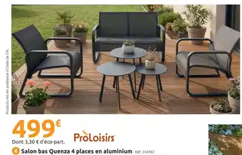 Cette Proloisirs salon bas quenza 4 places en aluminium est disponible dans les magasins ci-dessous en fonction de votre emplacement configuré: