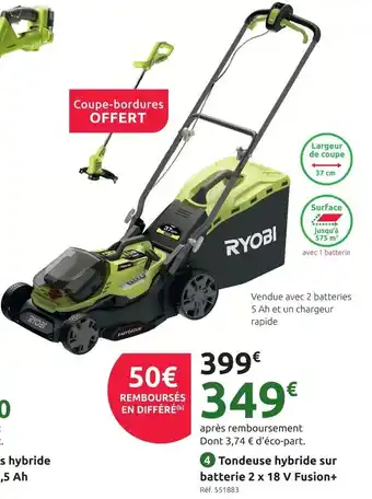 Offre Ryobi tondeuse hybride sur batterie 2 x 18 v fusion+ chez Mr Bricolage
