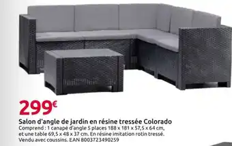 Actuellement, Salon d'angle de jardin en résine tressée colorado est en promotion chez Mr Bricolage. Toutes les informations utiles comme le prix, les conditions et la durée de validité sont affichées sur cette page. Consultez également les promotions similaires pour Salon d'angle de jardin en résine tressée colorado, afin de faire le meilleur choix. La promo Salon d'angle de jardin en résine tressée colorado est valable du 18-02-2026 au 15-03-2026. Si elle est expirée, regardez les autres offres équivalentes. Vous pouvez aussi suivre cette catégorie de produit pour être alerté lorsqu’une nouvelle promotion Salon d'angle de jardin en résine tressée colorado apparaît chez Mr Bricolage.Questions fréquemment posées au sujet de Salon d'angle de jardin en résine tressée colorado