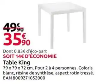 Table King bénéficie actuellement d'une réduction chez Mr Bricolage. Vous trouverez ici toutes les infos utiles sur les prix, la durée de validité et les conditions de l’offre. Pensez à consulter aussi d'autres offres et promotions similaires pour Table King afin d’acheter toujours au bon prix. La promo Table King est valable du 18-02-2026 au 15-03-2026. Offre terminée ? Pas de souci. D'autres offres sur ces produits sont peut-être déjà disponibles. Vous pouvez suivre cette catégorie de produits pour rester informé en cas de nouvelle promotion Table King chez Mr Bricolage. En comparant les offres, vous êtes sûr d’acheter au prix le plus bas possible.Questions fréquemment posées au sujet de Table King