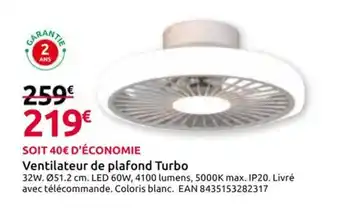 Actuellement en offre chez Mr Bricolage : Ventilateur de plafond Turbo ✅ Valable du 18-02 au 15-03.