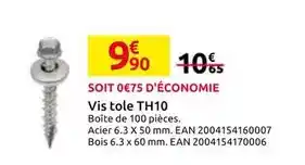 Le prix de l'offre Vis tole th10 se trouve également en haut de la page, ainsi que la date à laquelle l'offre est disponible. Vous pouvez également vérifier les prix dans le Catalogue Mr Bricolage actuel ou sur le site Internet de Mr Bricolage. Les offres vous permettent d'acheter les produits Mr Bricolage au prix le plus bas.