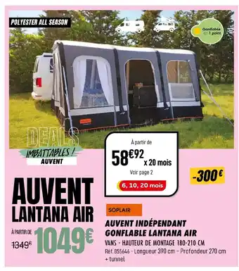 Actuellement en offre chez Narbonne accessoires : SOPLAIR Auvent indépendant gonflable lantana air ✅ Valable du 4-02 au 21-02.
