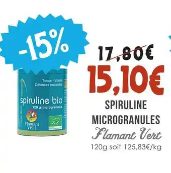 En plus de l'offre Flamant vert spiruline microgranules, Naturalia propose une large gamme de produits. Consultez le Catalogue Naturalia hebdomadaire pour découvrir les meilleures offres et promotions. En plus de Flamant vert spiruline microgranules, il y a aussi : Spiruline microgranules flamant vert, NUTRIVIE Spiruline & Flamant rose métal.