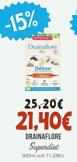 En plus de l'offre Superdiet drainaflore, Naturalia propose une large gamme de produits. Consultez le Catalogue Naturalia hebdomadaire pour découvrir les meilleures offres et promotions. En plus de Superdiet drainaflore, il y a aussi : Drainaflore superdiet, SUPERDIET Oméga 3 & Quatuor détox superdiet.